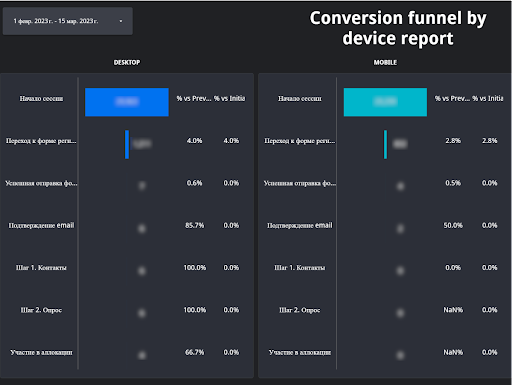 Теперь клиент мог посмотреть, что пользователи с десктопа доходят до интересующего нас последнего шага, а с мобильных устройств все пользователи отваливаются на шаге верификации ТГ. Это говорило о том, что для нас более качественный трафик приходит с ПК, или же, что есть какая-то проблема в мобильной версии сайта. Этот шаг был неудобен для пользователя.