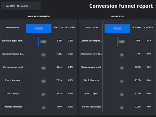 Мы увидели, что хоть и авторизация через гугл менее популярный путь пользователей, но в конечном результате процент конверсии из шага регистрации в последний шаг воронки выше.