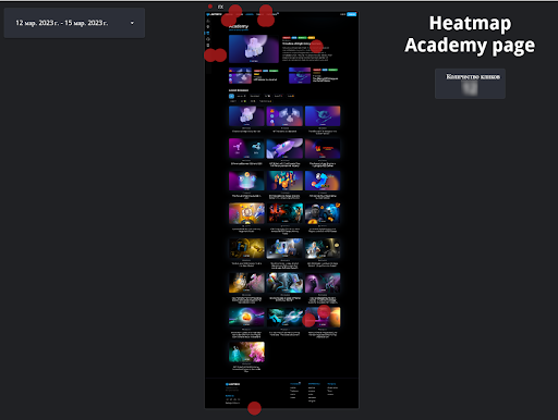 Далее решили посмотреть, какие статьи кликаются пользователями. Academy — это блог предположительно полезных статей для пользователей. Большинство кликов было сконцентрировано вверху страницы. Но были и те, которые пролистывали вниз на конкретную статью в самом низу.